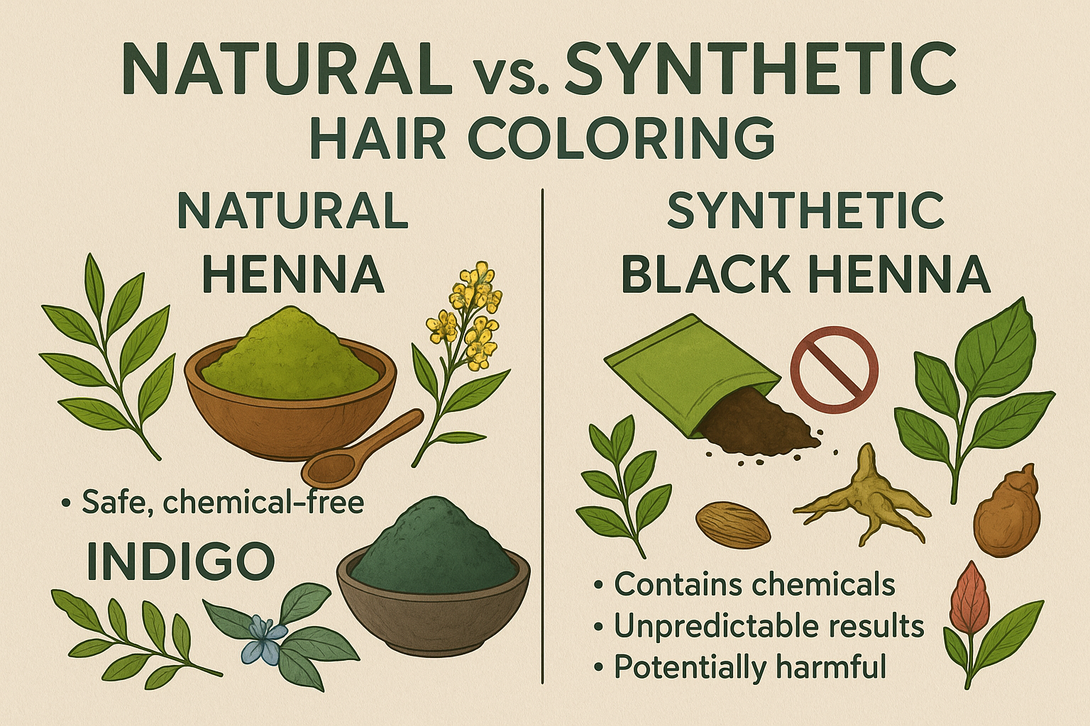 ✨ Many people want shiny jet-black hair instantly — but beware of products sold as “Black Henna”. Not all are natural. Let’s break it down 👇